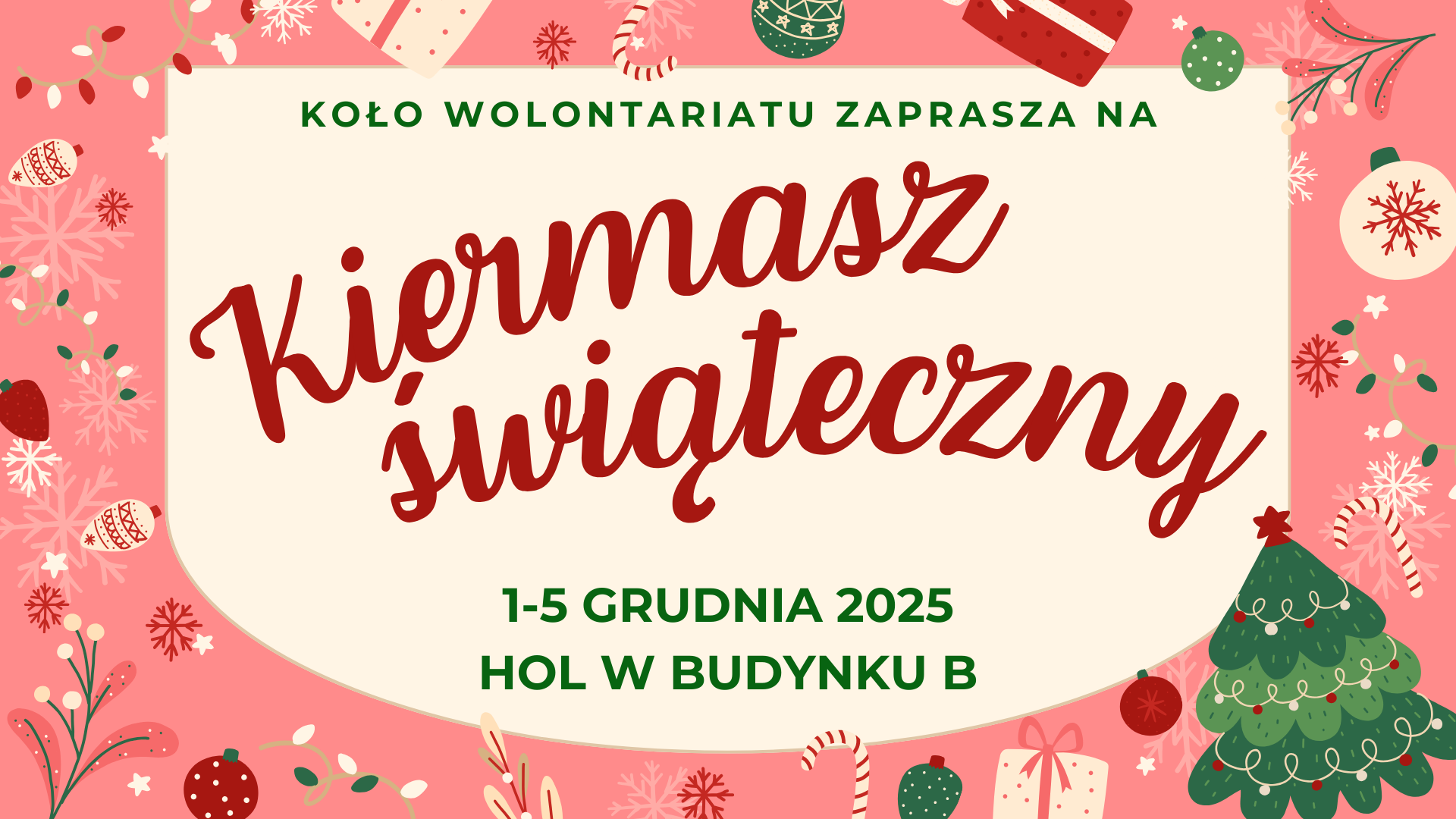 Wolontariat Milenium serdecznie zaprasza na Charytatywny Kiermasz Świąteczny. Przez cały przyszły tydzień, od 1 grudnia do 5 grudnia, w holu w budynku B będzie można nabyć m.in. pyszne ciasto, ozdoby, stroiki, opłatki i wiele innych. Zebrane środki ze sprzedaży zostaną przekazane na cele charytatywne.